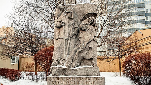 Выполнен на гранитном пилоне высотой 4 метра, в котором высечены три женские фигуры. В руках одной из женщин клещи, вторая женщина поддерживает под руку молодую девушку с небольшим куском хлеба в руках[2].