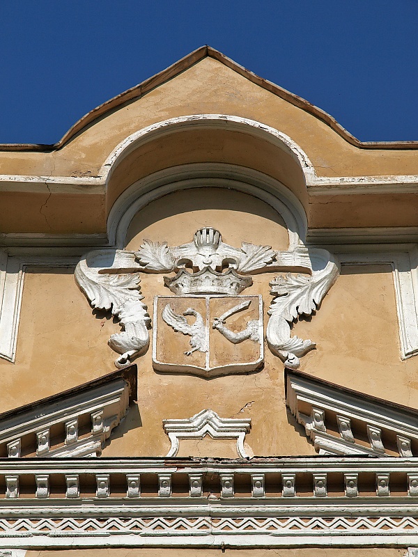 Щит разделен перпендикулярно на две части, из которых в правой в серебряном поле виден до половины чёрный орел с золотым на голове венцом, имеющий золотые нос и когти; в левой части в голубом поле выходящая из облака рука в латы облеченная с мечем (польский герб Малая Погоня).