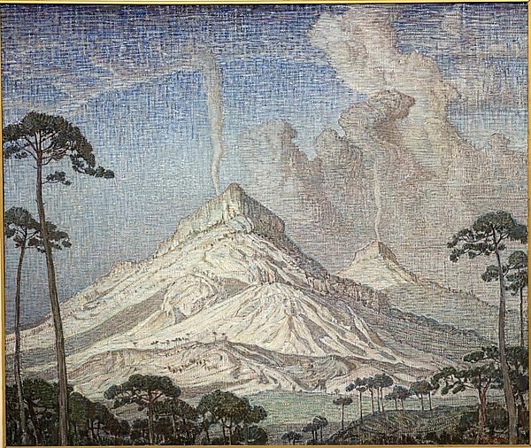 На картине представлен пейзаж с двумя крупными светлыми горами конусовидной формы, на вершинах которых поднимаются столбы белого дыма. Передний план оформлен группами сосен, располагающихся справа и слева и создающих эффект 'кулис' по краям композиции. На фоне изображено голубое небо с клубящимися облаками.