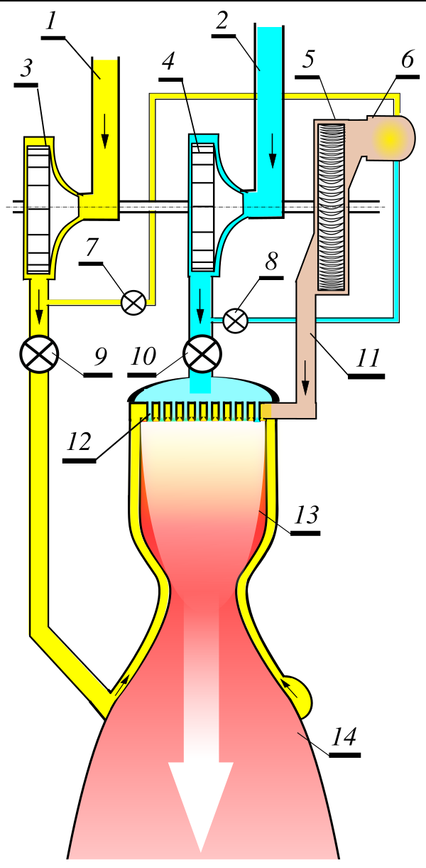 Компоненты топлива — горючее (1) и окислитель (2) поступают из баков на центробежные насосы (3, 4), приводимые в движение газовой турбиной (5). Под высоким давлением компоненты топлива поступают на форсуночную головку (12) — узел, в котором размещены форсунки, через которые компоненты нагнетаются в камеру сгорания (13), перемешиваются и сгорают, образуя нагретое до высокой температуры газообразное рабочее тело, которое, расширяясь в сопле, совершает работу и преобразует внутреннюю энергию газа в кинетическую энергию его направленного движения. Через сопло (14) газ истекает с большой скоростью, сообщая двигателю реактивную тягу.