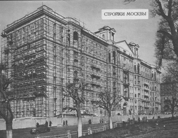 При строительстве использовался труд германских военнопленных, даже большую часть материалов взяли из реквизированных запасов. Согласно некоторым источникам, красные гранитные плиты на фасаде здания были приготовлены по приказу Гитлера для изготовления монумента в честь захвата Москвы. Этот же камень использовался для отделки некоторых зданий на Тверской улице[5][3]. Один из жителей дома вспоминал: