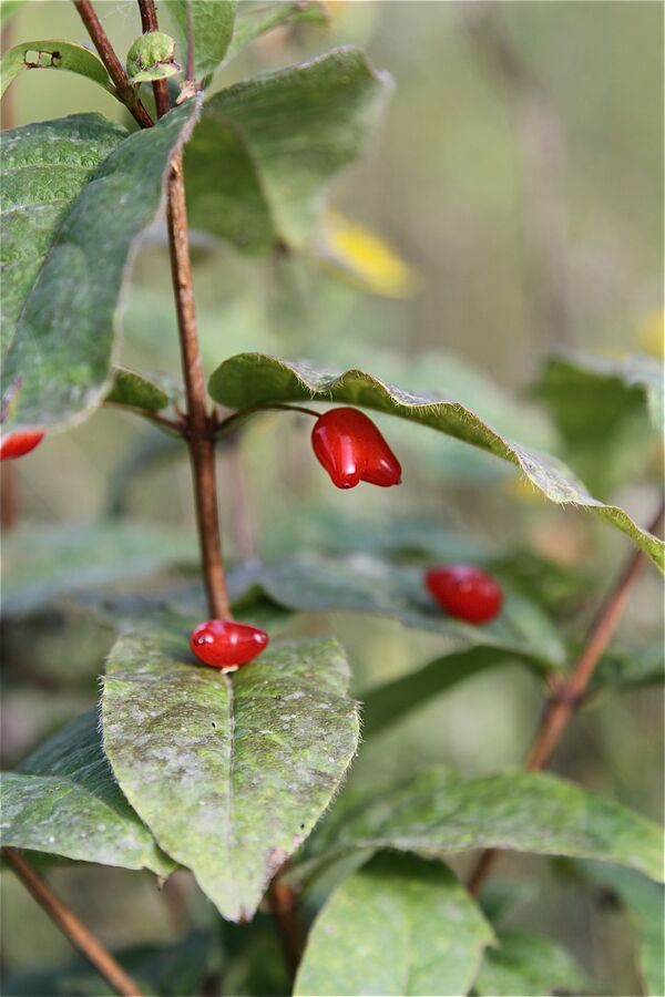 Плоды яйцевидные, ярко-красные, блестящие, попарно сросшиеся основаниями и расходящиеся наверху наподобие рожек, созревают в конце августа-сентябре.