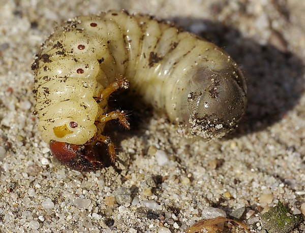 Отрождение личинок обычно происходит летом[6]. Личинки имеют типичный для представителей семейства пластинчатоусые внешний вид и достигают к концу своего развития длины до 80—110 мм[5]. Личинка с толстым С-образно изогнутым телом, жёлто-белого цвета, покрытым редкими волосками и скоплениями шиловидных щетинок на четвёртом-девятом тергитах и протергите десятого тергита. Голова тёмно-красно-бурая, с грубыми морщинками. Темя личинки покрыто многочисленными волосками. Верхние челюсти массивные, треугольной формы, с довольно короткими вершинами и 2 зубцами. Усики длинные, их второй членик самый длинный, первый короче второго, но чуть длиннее третьего. Дыхальца большие. Самое крупное из них — первое, остальные практически не отличаются друг от друга по величине. Анальный сегмент разделён кольцевой, поперечной бороздкой на 2 части. Его вершина равномерно закруглена. Анальное отверстие имеет форму поперечной щели. На задней части анального тергита имеется дополнительная складка. Анальный тергит покрыт многочисленными мелкими волосками, среди которых рассеяны более редкие, длинные волоски, а в самой задней его части — мелкие, шиповидные щетинки. Ноги довольно длинные, с сильно развитыми длинными тазиками. Коготки короткие, почти прямые[5][6][32].