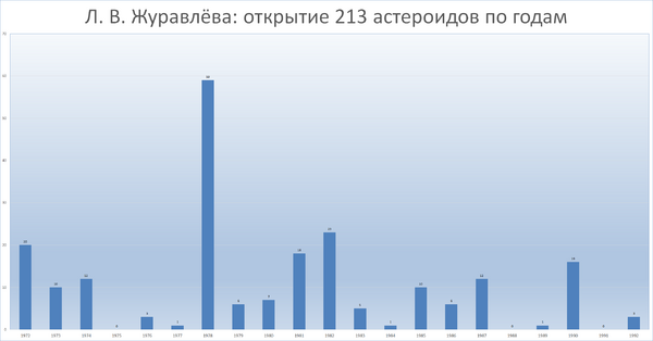 На её счету такие малые планеты, как (1858) Лобачевский, (1859) Ковалевская, (1909) Алехин, (1959) Карбышев, (2188) Орлёнок, (2374) ВладВысоцкий, (2562) Шаляпин, (2576) Есенин, (2720) Пётр Первый, (2740) Цой, (3067) Ахматова, (3108) Любовь, (3214) Макаренко, (3260) Визбор, (4166) Понтрягин, (9838) Фальц-Фейн, (32766) Воскресенское и многие другие.