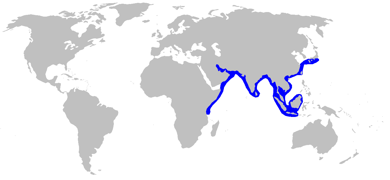 Обитает в западной части Индийского и Тихого океанов у берегов Бангладеш, Брунея, Камбоджи, Китая, Индии, Индонезии, Японии, Макао, Малайзии, Мьянмы, Омана, Пакистана, Филиппин, Сингапура, Сомали, Шри-Ланки, Тайваня, Таиланда и Вьетнама. Как правило, держится недалеко от берега на глубине 10—13 м, часто вблизи скалистого дна. Встречается также в низовьях рек Малайзии, Суматры и Борнео, поскольку, подобно тупорылой акуле, терпимо относится к воде пониженной солёности[2][3].