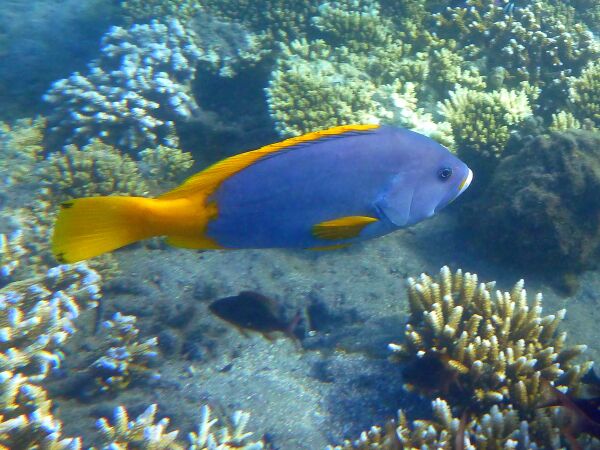 Голова и тело от тёмно-синевато-фиолетового до тёмно-серовато-синего цвета, иногда с бледно-голубыми крапинками. Тело и голова молоди небесно-голубого цвета. Крупные взрослые особи тёмно-серые, тёмно-синие, фиолетовые, каштаново-коричневые или почти чёрные. Плавники и челюсти ярко-жёлтые; у некоторых особей края хвостового плавника, края мягких частей спинного и анального плавников и кончики брюшных плавников черноватые. Интенсивность желтого цвета уменьшается с ростом рыб[4].