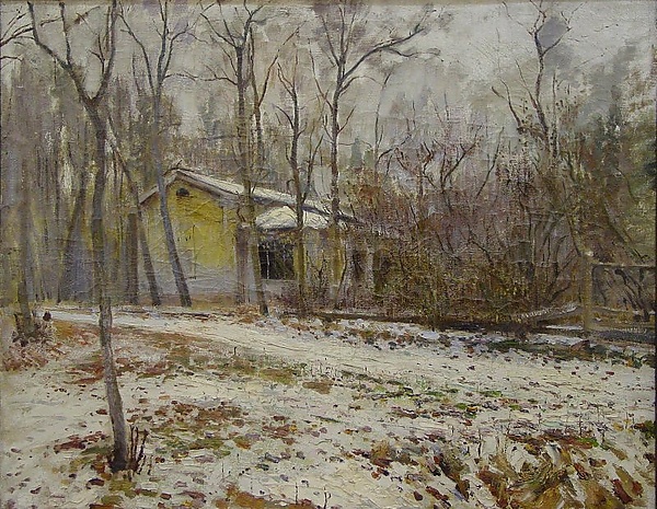На первом плане картины изображён участок земли с просёлочной дорогой, покрытой жёлтыми листьями и слегка припорошенной снегом, что подчёркивает наступление осени. На втором плане, среди высоких частых деревьев, расположен одноэтажный дом с верандой, выходящей в сад. Небо изображено пасмурным, что усиливает атмосферу спокойствия и предстоящих холодов.