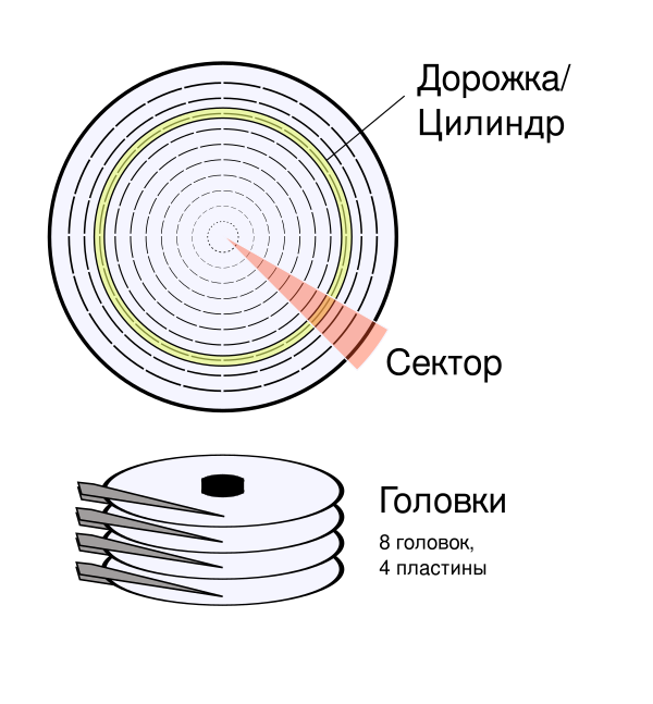 Цилиндр — совокупность дорожек, равноотстоящих от центра, на всех рабочих поверхностях пластин жёсткого диска. Номер головки задаёт используемую рабочую поверхность, а номер сектора — конкретный сектор на дорожке.[источник не указан 1117 дней]