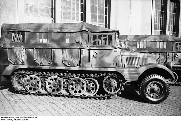 - На 1-м образце — из семи опорных катков, расположенных в шахматном порядке, и переднего ведущего колеса гребневого зацепления (стандартная гусеничная тележка Sd Kfz 11[6])[1].