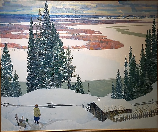 На этюде представлен зимний пейзаж с деревянной постройкой на переднем плане, окружённой ёлками и огороженной изгородью. Неподалёку находится человек, который смотрит на противоположный берег реки, покрытый снегом и уходящий в лесные дали. У постройки видна ещё одна человеческая фигура у открытого колодца. С нижнего берега выглядывает крыша с крестом. Вдали, на противоположном берегу, изображён город.