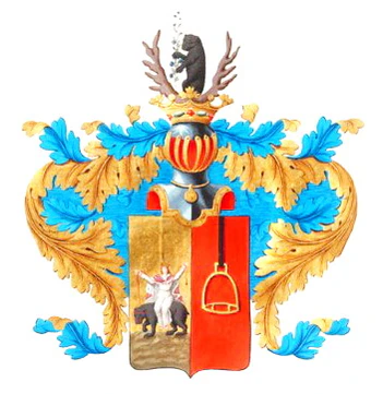 Щит разделён перпендикулярно на две части, из коих в правой в золотом поле изображена сидящая на чёрном Медведе Дева в белой Одежде, имеющая на голове Венец и волосы распущенные, а руки со шнурком, на котором привязан Медведь, поднятые вверх (польский герб Равич). Во второй части в красном поле золотое Стремя, висящее на Ремне (польский герб Стремя).