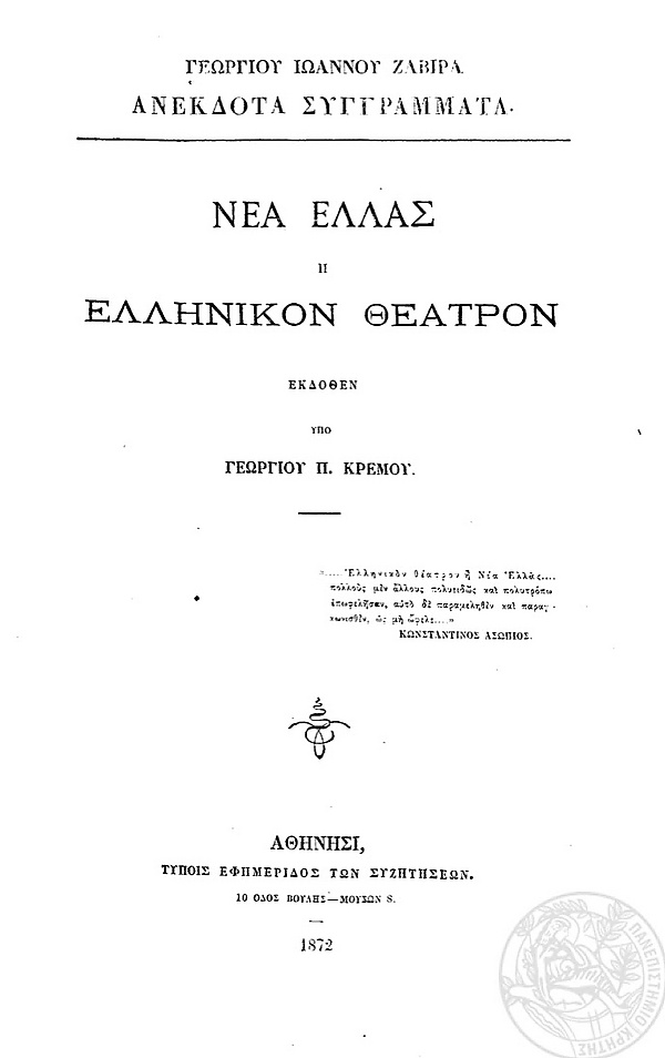 - Νέα Έλλας ή έλληνικόν θέατρον (греч.). Anemi. Πανεπιστήμιο Κρήτης. Дата обращения: 11 июня 2018. Архивировано из оригинала 4 марта 2016 года.