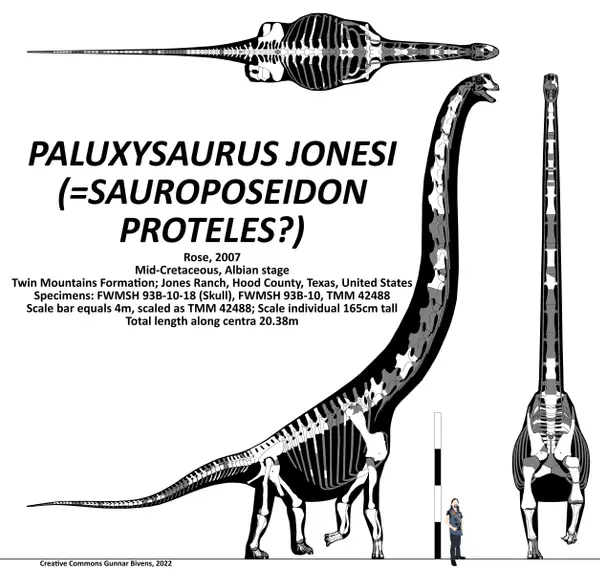 В 2007 году американский палеонтолог Питер Роуз по ископаемых остаткам и следам из Джонс-Ранч, округ Худ, северо-центральный Техас, научно описал род завропод Paluxysaurus, к которому отнёс единственный вид — P. jonesi. Родовое название относится к расположенной неподалёку от места обнаружения остатков общине Пэлакси и одноимённой реке, протекающей через эту местность. Видовое название дано в честь Уильяма Джонса, с разрешения которого на протяжении почти двух десятилетий (на момент открытия) на его земле проводились раскопки. В качестве голотипа был выбран образец FWMSH 93B-10-18, представленный ассоциированными верхней челюстью, носовой костью и зубами. Также были описаны семь шейных позвонков, тринадцать спинных и тридцать хвостовых, а также почти все кости конечностей и поясов конечностей[11]. В 2012 году Майкл Д'Эмик и Брэди Форман описали дополнительный материал завропод из формации Кловерли в Вайоминге и пришли к выводу, что материал из Оклахомы, Техаса и Вайоминга принадлежит к одному и тому же виду, что сделало Paluxysaurus и P. jonesi младшими синонимами Sauroposeidon и S. proteles соответственно[6].