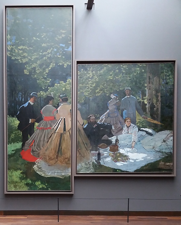 Между тем именно тогда, в 1863 году, Эдуард Мане создал одноимённую картину (холст, масло, 208 × 264,5 см; Музей Орсе)[8], отвергнутую Салоном 1863 года из-за своей «непристойности»[9]. Появление данной работы на Салоне отверженных эпатировало публику и ознаменовалось скандалом из-за изображения обнажённых женщин в группе одетых людей, среди которых было можно узнать достаточно известных личностей[10][11]. Моне задумал своё полотно в качестве вызова и одновременно дани Мане, избрав ту же тему, но подойдя к ней с другим стилем, которым тоже хотел удивить зрителя, но уже с другой стороны[12][10]. Как и ранее Жерико, Моне в тот момент было только 25 лет, когда он решился на создание работы, которая была бы в три раза больше, чем «Завтрак» Мане, и в два раза шире, чем «Завтрак на охоте» Курбе[13] (холст, масло, 207 × 325 см; Музей Вальрафа-Рихарца)[14].