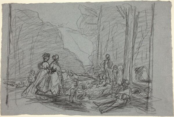 Работа над картиной началась весной 1865 года[5]: с апреля по октябрь Моне с одной целью — написать сцену пикника с множеством фигур — пробыл в Шайи[18], на окраине леса Фонтенбло[19], своеобразной студии импрессионистов[20]. Проведя несколько месяцев в ожидании Базиля, модели и одного из героев будущего полотна, Моне создал ряд пейзажных этюдов, варьирующихся от маленьких эскизов до больших набросков[21]. Из них можно выделить несколько отдельных произведений пейзажного искусства, которые сам Моне считал значительными среди остальных своих работ[18]: «Дорога на Шайи через лес Фонтенбло» (холст, масло, 97 × 130,5 см; Музей Ордрупгаард)[22], «Дорога на Шайи» (холст, масло, 43 × 59 см; Музей Орсе)[23], «Дуб Бодмера, лес Фонтенбло на дороге в Шайи» (холст, масло, 96,2 × 129,2 см; Метрополитен-музей)[24]. Работал он на природе, широко и свободно, достигнув тех тонов, того контраста света и тени, каковых на то время не было ни у Курбе, ни у Мане[21]. Эти эскизы больших деревьев с отбрасывающими тень ветками и листьями, созданные примерно в одних и тех же местах, послужили ландшафтным фоном для будущего «Пикника»[25][26]. Последняя работа особо примечательна тем, что на ней запечатлён дуб Бодмера, названный так в честь швейцарского художника Карла Бодмера, который на Салоне 1852 года выставил работу с изображением данного дерева, после чего оно стало любимцем художников и фотографов, в частности Гюстава Ле Гре[27].