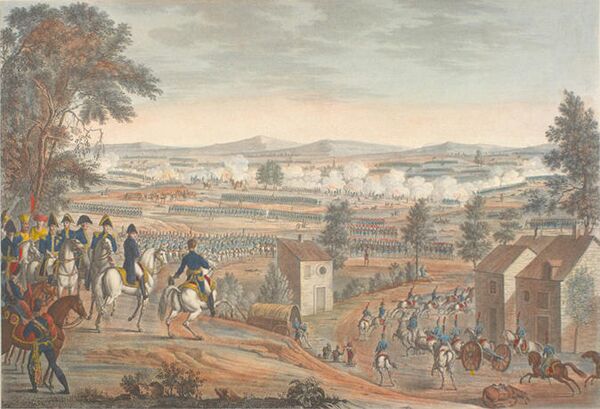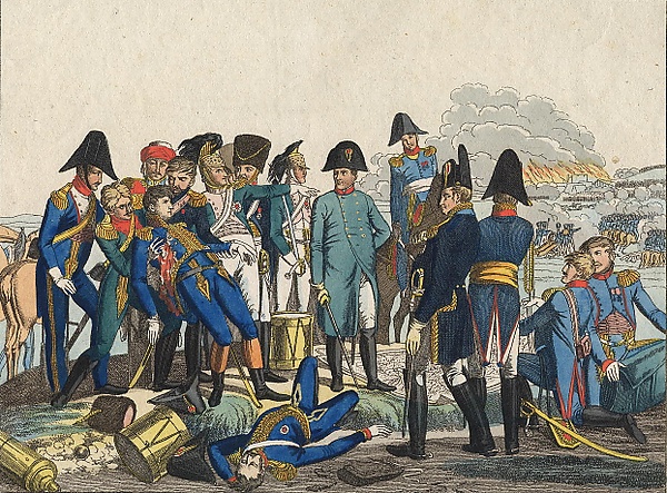 4 (16) октября 1813 года началось сражение, позже получившее название «Битва народов». Первый день ознаменовался ожесточённой борьбой: французская кавалерия Мюрата пробила центр, и решающим стало введение союзной тяжёлой кавалерии по распоряжению Александра I, что позволило удержать узловые высоты и стабилизировать фронт[62]. Усиление союзников подходом армий Беннигсена и Карла Юхана, а также переход саксонских, баденских и вюртембергских частей на их сторону и подавляющее артиллерийское превосходство предопределили исход. 18 октября бои разгорелись уже в предместьях Лейпцига, а 19-го при попытке отхода взрыв моста через Эльстер отрезал значительную часть французских войск, в том числе оставленных в городе раненых; маршал Ю. А. Понятовский погиб при переправе[63][64]. Союзники захватили десятки тысяч пленных и сотни орудий; стратегический итогом сражения стала утрата Наполеоном контроля над Германией и развал системы вассальных образований[65][66].