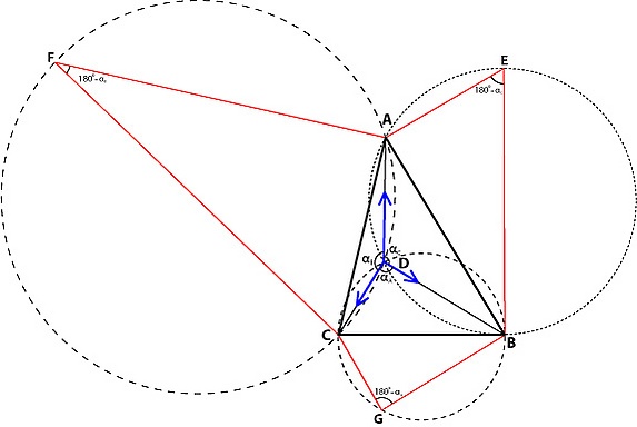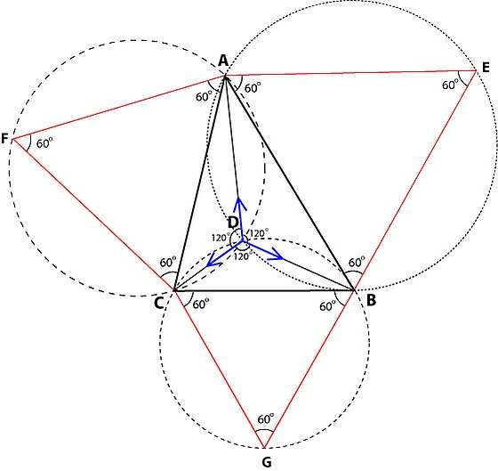 4. Это приводит к построению равносторонних треугольников ACF и BCG, где F и G лежат вне треугольника ABC, а также к построению двух других окружностей вокруг этих равносторонних треугольников. Все три окружности пересекаются в одной точке D и углы, опирающиеся на отрезки AD, BD и CD будут равны 120°, что доказывает оптимальное положение точки.
