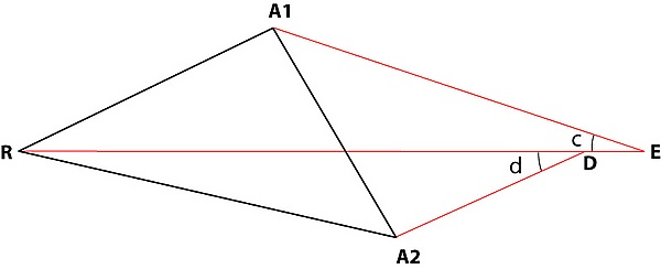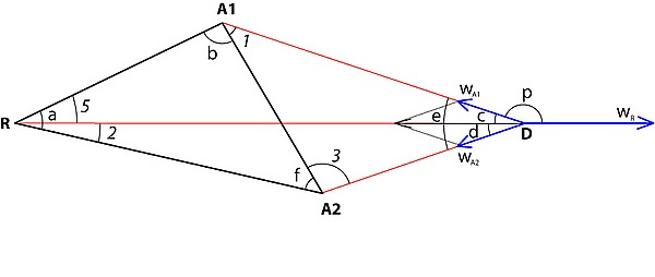 1. В строящемся треугольнике RA2H, который накладывается частично на треугольник размещения точек A1A2R, сторона RA2 пропорциональна силе притяжения A1w в направлении к A1, сторона RH пропорциональна силе притяжения A2w в направлении к A2, а сторона A2H пропорциональна силе отталкивания Rw в направлении от R.