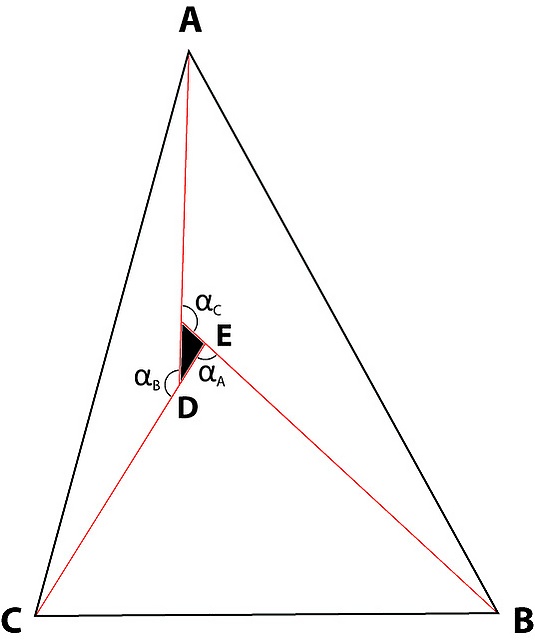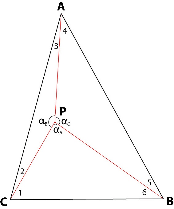 где k = (CB/CA) (sin ∠αB / sin ∠αA), а k’ = (∠A +∠B + ∠αC) − 180° ;