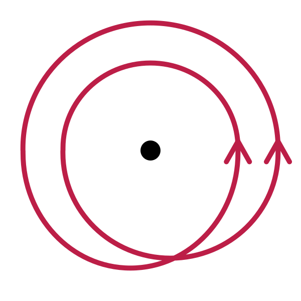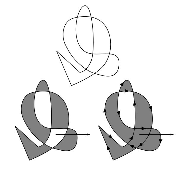 Рассмотрим число оборотов, которые делает ориентированная граница многоугольника вокруг данной точки P. В алгебраической топологии это число называется индексом точки относительно кривой.[2] Оно может быть вычислено следующим образом. Как и раньше, выпустим луч из P в произвольном направлении и рассмотрим рёбра, которые он пересекает. Каждому пересечению присвоим число +1 или -1, в зависимости от того, как ребро пересекает луч — по часовой (слева направо) или против часовой стрелки (справа налево). Эти два случая можно различить по знаку скалярного произведения между направляющим вектором ребра и нормалью к направляющему вектору луча.[3] Сумма полученных величин и есть индекс точки относительно кривой. Сумма будет положительной или отрицательной, в зависимости от ориентации границы. Если она не равна нулю, то будем считать, что точка лежит внутри многоугольника, иначе — снаружи.