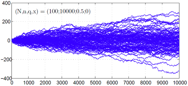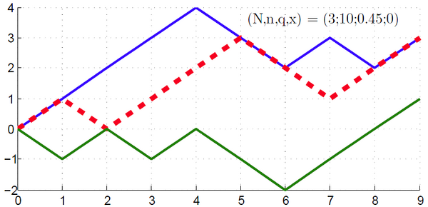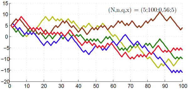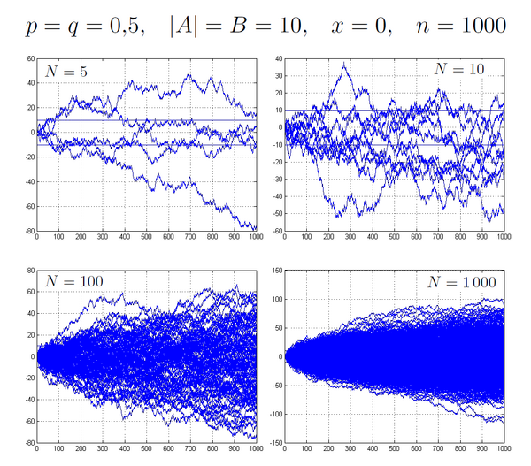 Возникает разумный вопрос: зачем считать , начиная только со второй величины (for i = 2:n)? Дело в том, что это делается исключительно в целях наглядной визуализации. При построении графика в следующем коде будут строиться траектории , и если бы было написано for i = 1:n, то тогда уже с самого первого значения некоторые траектории бы выходили из , некоторые — из . Так как в данной программе из соображений оптимальности лучше не задействовать нулевое значение (из него частица выходит, но не рисуется, так как прибавление происходит сразу), то просто-напросто сдвинем нумерацию на оси абсцисс на единицу вправо. Теперь проведём серию тестов и наглядно рассмотрим возможные траектории при некоторых вероятностях, длинах игры и количестве игр.