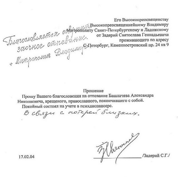 В феврале 2004 года Задерий добился от епархии разрешения на отпевание Александра Башлачева.