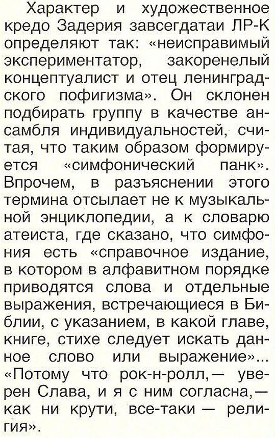 Так началась легенда, спрятанная в книгах за парой коротких строк. Помимо Кролика и Задерия в коллективе играли известные впоследствии Михаил Нефёдов (барабаны), Павел Кондратенко (клавиши) и одарённый гитарист Владимир "Кровавый" Богатырёв. По версии Задерия, Кровавым Вову прозвали за то, что порой после ошеломительных гитарных пассажей его пальцы были изодраны о струны в кровь.
