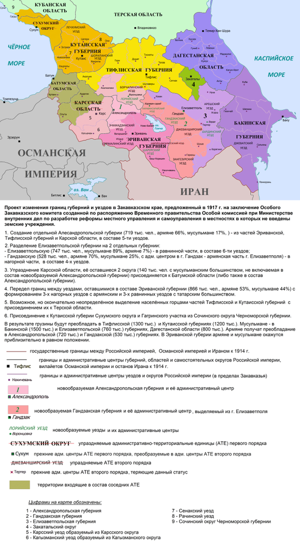 В декабре 1917 года Закавказский комиссариат издал Декрет «О введении земства в Закавказье». Согласно этому документу, вся территория Закавказья делилась на земли, «в которых не возникает вопроса о переделе административных границ», и те, в которых Закавказский комиссариат собирался в течение месяца произвести «передел административных границ в спорных губерниях и уездах (округах)». Для реализации этих предложений намечалось предварительно истребовать мнение по армянского, грузинского и мусульманского национальных советов. Бесспорными в отношении административных границ признавались Бакинская губерния, Дагестанская область, Закатальский округ, Арешский и Нухинский уезды. Спорными в отношении административных границ признавались Эриванская губерния, Елисаветпольский, Казахский, Джеванширский, Шушинский, Зангезурский, Карягинский и Борчалинский уезды[11].