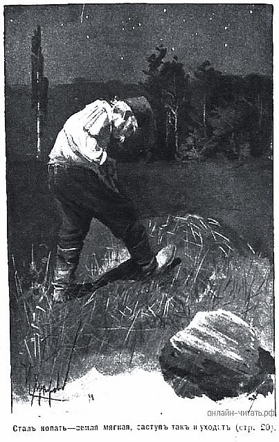 На следующий день, когда наступили вечерние сумерки, дед взял заступ и лопату и пошёл искать то место, но не мог его найти. Он видел либо гумно, либо голубятню, но не находил места, откуда видно и то и другое. Потом начался дождь, и дед побежал в курень, а там ругал чёрта последними словами. На следующий вечер, проходя мимо заколдованного места, он в сердцах ударил по нему заступом и снова оказался там, где была могилка, помеченная веткой. С трудом он своротил могильный камень. Хотел понюхать табак, как вдруг кто-то чихнул над ним и забрызгал ему лицо. Дед начал копать и наткнулся на котёл. Тут птичий нос, баранья голова и медведь стали повторять за дедом каждое слово. Он увидел в темноте какую-то страшную харю, бросил котёл и хотел убежать. Но оглянулся и не увидел никакой нечисти. Он всё же решил достать котёл, с трудом его вытащил и бросился бежать с ним к дому, по дороге ему всё время казалось, что его бьют прутьями по ногам.