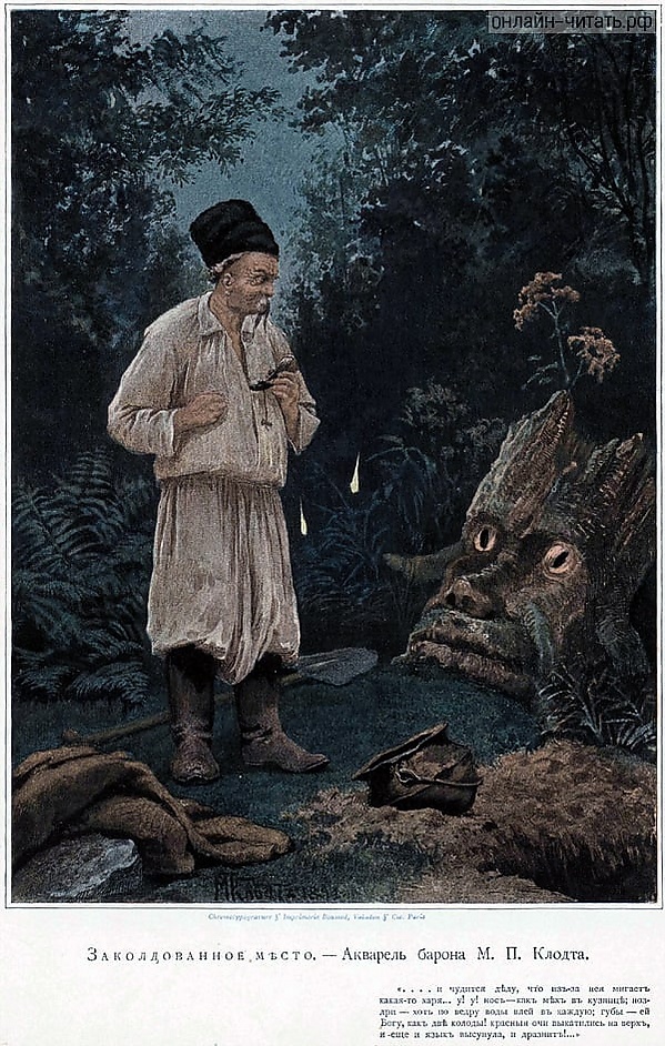 ...В «Заколдованном месте» волшебная природа этoro «места» состоит в том, что в нём как бы пересекаются волшебный и обыденный миры. Вступивший на него получает возможность перехода из одного в другой. Эти миры очень похожи, но сходство их — лишь внешнее: сказочный мир как бы притворяется обыденным, надевает его маску[9].