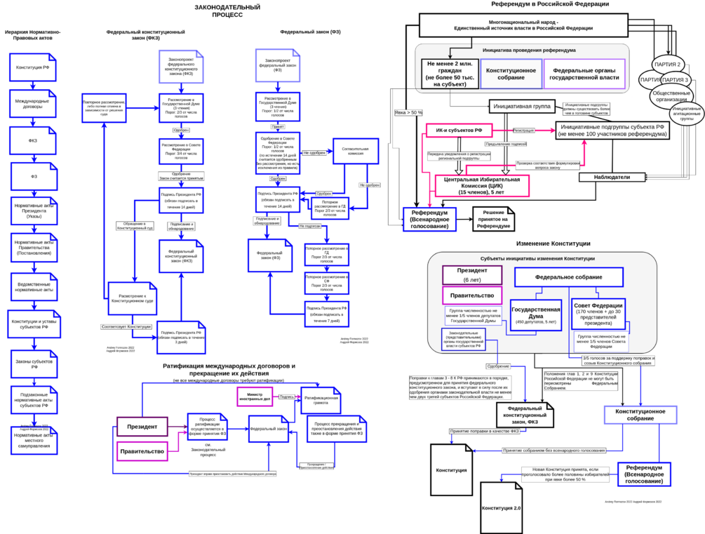 Диаграмма основных процедур законодательного процесса в Российской Федерации. Представлена иерархия нормативно-правовых актов, процедуры принятия конституционных федеральных законов (ФКЗ), федеральных законов (ФЗ), ратификация международных договоров, изменения Конституции и процедура проведения референдума.