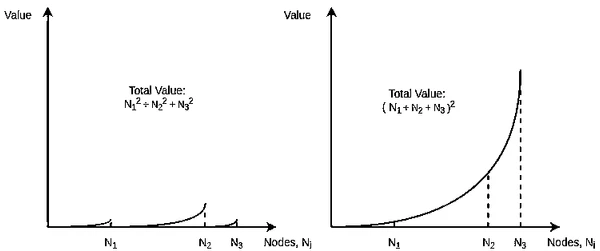 Закон Меткалфа гласит, что полезность сети пропорциональна половине квадрата () численности пользователей этой сети. Это происходит из того факта, что количество уникальных связей в сети с количеством узлов может быть математически выражено треугольным числом , которое асимптотически эквивалентно .