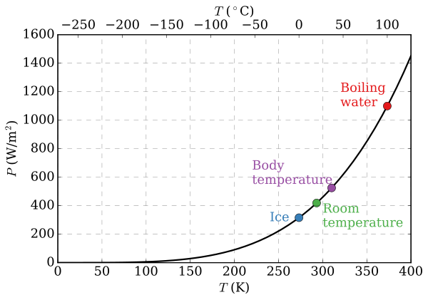 где A — постоянная зависящая от площади поверхности тела и температура дана в Кельвинах[14].