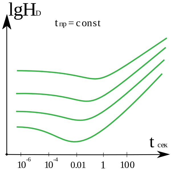 Типичная зависимость плотности почернения фотоматериала от выдержки при постоянной экспозиции показана на рисунке 1.