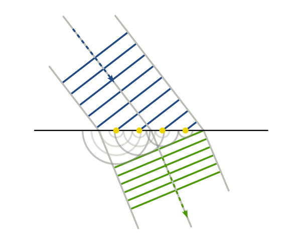 Закон преломления: луч падающий, луч преломлённый и перпендикуляр к границе раздела двух сред лежат в одной плоскости, причём отношение синуса угла падения к синусу угла преломления есть величина постоянная для данных сред — относительный показатель преломления :