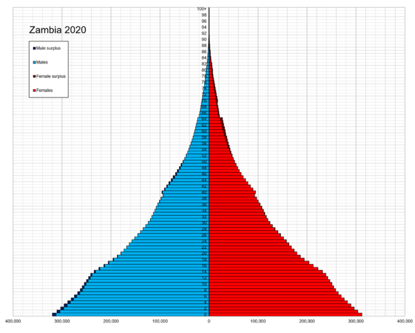 Население Замбии составляет около 19,61 миллионов человек по последней переписи населения 2022 года, из которых бемба 21,5 %, тонга 11,3 %, лози 5,2 %, другие 45,9 %.[15]. Плотность населения — 19,3 человек на км². В городах проживает 39,2 % населения страны (2011)[15].