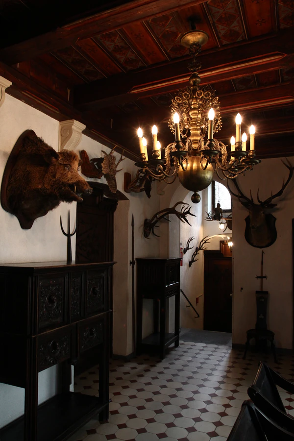 На стенах комнаты представлены охотничьи трофеи из окрестных лесов. Здесь также выставлены высокие деревянные шкафы XVI века. Здесь стоит обратить внимание на стекла на окнах — они выпуклой формы, так называемый «бычий глаз». На стёклах изображены гербы прежних владельцев замка. Примерно так выглядели первые стёкла, использовавшиеся для остекления окон в XV веке. На двери можно увидеть специальное устройство, позволяющее даже после приёма такого количества вина, попадать ключом в замочную скважину с первого раза.