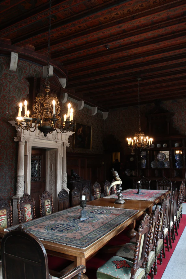 Самое большое помещение замка. Мощные дубовые колонны поддерживают потолок. Верхние части колонн покрыты резьбой (мотивы резьбы на всех колоннах различны). Верхняя часть камина украшена двумя скульптурами львов в рыцарских геральдический шлем. Зал украшают две картины: «Даная» школы Тициана и «Похищение сабинянок» — школы Пауля Рубенса (оригиналы картин экспонируются в художественной галерее Прадо, Мадрид. На старинном сундуке в стиле Ренессанс расположены японские, и напротив — китайские вазы. Мебель, собранная в этом зале, дает представление о жизни в XIX веке.