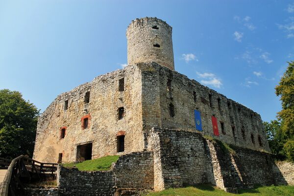 Замок окружал довольно глубокий ров, над которым был перекинут деревянный мост, ведший к воротам с проходом для пеших. Значительно ниже, с юго-восточной стороны замка, были построены многочисленные деревянные хозяйственные здания, в результате чего появился предзамок, который позже (скорее всего, в конце XV века) был окружен отдельной стеной с въездными воротами. Усиление оборонительных свойств замка и его военная модернизация были связаны с неспокойным периодом гуситских войн в первой половине XV века, тем более, что одна из гуситских баз располагалась в городе Гливице в Силезии, откуда осуществлялись вооруженные набеги на территории Малопольши.