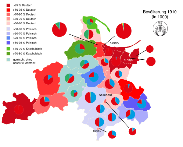 В 1895 году население Западной Пруссии составляло 1 494 тысяч человек, в том числе 702 тысяч лютеран, 758 тысяч католиков и около 20 тысяч евреев. Большинство населения составляли немцы, также имелось 439,6 тысяч поляков и 53,6 тысяч кашубов[2].