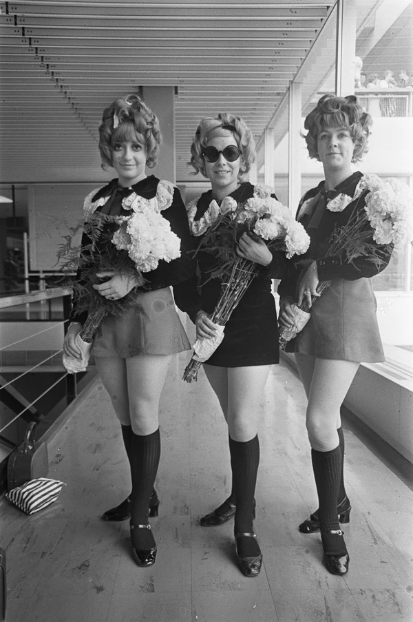 Источником вдохновения служили топ-модели того времени, такие как Твигги, Джин Шримптон, Коллин Корби, Пенелопа Три, Эди Седжвик и Верушка. В моде были накладные ресницы и бледная помада. К 1968 году юбки стали ещё короче — появились «микро-мини», включая «ангельское платье» с расклешённой юбкой и длинными рукавами-трубами. Для вечера выбирали облегающие «коктейльные» платья из кружева[50] или воздушные платья-беби дол. Мини-юбки носили такие иконы стиля, как Твигги, Голди Хоун на шоу «Rowan and Martin’s Laugh-In» (в 1967 году) и Жаклин Кеннеди на своей свадьбе с Аристотелем Онассисом в 1968 году. Иногда женщины носили боа.