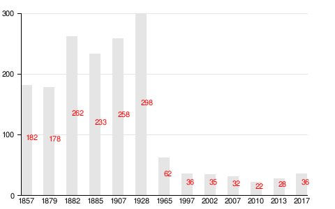 Число жителей по семейным спискам 1879 г.: 79 м. п., 98 ж. п.; по приходским сведениям 1879 г.: 77 м. п., 101 ж. п.[5]