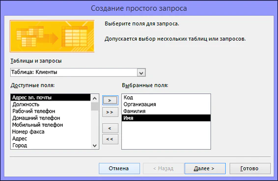 Для работы с СУБД Access предусмотрен специальный, визуальный, дружелюбный к пользователю интерфейс, в котором запрос на выборку данных можно осуществить через Мастер запросов (интерфейс манипулирования запросами с базой данных Access). В нём можно выбрать Тип запроса, нужную таблицу и Доступные поля с целью сформировать Выбранные поля для получения в результате обработки запроса динамической таблицы, содержащей структурированные данные из Доступных полей. Осуществив запрос, пользователь получает нужную ему таблицу данных, извлечённых из общей базы данных. Более сложные запросы можно сформировать с помощью Конструктора запросов. Подробные инструкции по работе с этими инструментами содержатся в файлах помощи по СУБД Access. Формирование запроса из СУБД Access в Мастере запросов показано на рисунке. Манипуляции с данными делятся на поиск, сортировку и фильтрацию данных. СУБД Access позволяет работать и с многотабличными базами данных. Возможна организация использования стека для организации рекурсивных вызовов.