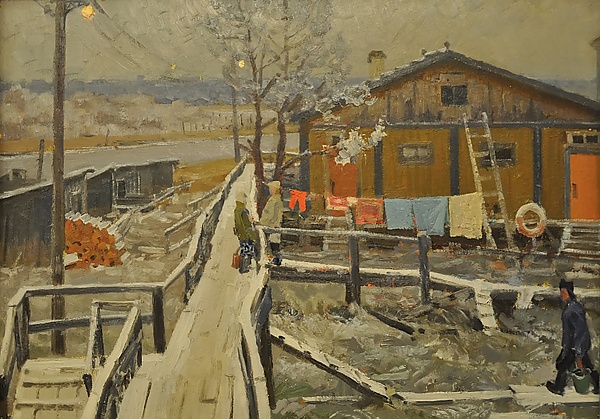 На картине в традициях бытового жанра изображены мужчина и женщина, беседующие на заиндевелых деревянных мостках. Слева расположены сараи, справа — деревянный дом с деревом, у которого на верёвке развешено бельё. Справа к мосткам подходит мужчина с вёдрами. В глубине композиции видна река с деревьями и постройками на противоположном берегу, что придаёт работе черты пейзажа.