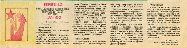 10 января 1967 года «Пионерская правда» напечатала Положение о военно-спортивной игре «Зарница» и приказ № 1 первого командующего игрой, Героя Советского Союза, маршала артиллерии Василия Ивановича Казакова.[5]