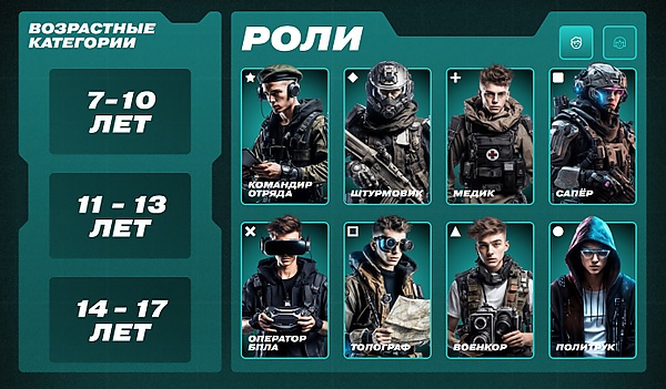 Возрастные категории: 7-10 лет, 11-13 лет и 14-17 лет. Для участников команд предусмотрены конкретные роли[12]: