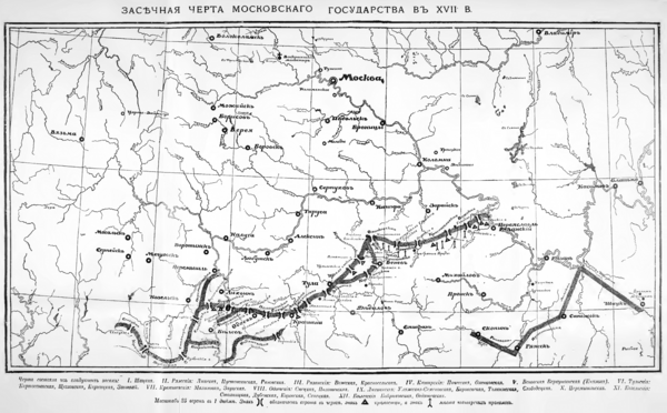 Засеки представляли собой заграждения из деревьев средних и более размеров, поваленных крест-накрест вершинами в сторону противника. Помимо своей простоты и быстроты устроения, такие засеки являлись труднопреодолимым и трудноуничтожаемым препятствием для наступающих отрядов. Первой крупной фортификационной линией являлась Большая засечная черта, построенная при Иване Грозном. Она входила в общую систему обороны Русского государства и состояла из укреплённых городов-крепостей (в 1630 году их насчитывалось свыше сорока), собственно засечной черты в полосе между Мещёрскими и Брянскими лесами, тыловой линии по течению реки Оки и поселений засечной стражи[2]. Засечная черта состояла из звеньев. За состоянием засек наблюдал Пушкарский приказ[3]. Следующим крупным проектом, отодвинувшим границы далеко на юг, стала Белгородская черта (середина XVII века).