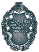- Нагрудный знак к почётному званию «Заслуженный мастер народного творчества Украины» имеет форму овального венка, образованного двумя ветвями лавровых листьев. Концы ветвей внизу обвиты лентой. В середине венка помещен фигурный картуш с надписью «Заслужений будівельник». Картуш венчает малый Государственный Герб Украины.