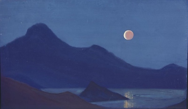 В центре композиции изображена тёмно-фиолетовая гора с тремя невысокими вершинами на фоне ярко-синего неба. На переднем плане слева, в центре и в правом нижнем углу располагаются тёмные каменные силуэты, выделяющиеся на фоне синей водной глади. В правой верхней части картины представлена полная Луна, частично закрытая светло-розовым диском.