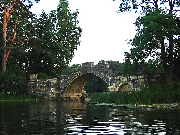 Гатчина. «Львиный мост»Построен по проекту А.Д.Захарова в 1799-1801 г.[7] Второе название мост получил из-за каменных львиных масок, которые украшают замковые камни его трех арок. Кроме этих каменных масок по замыслу архитектора на невысоких постаментах моста предполагалось установить скульптурные группы, аллегории «Изобилие рек». После трагической гибели императора Павла I этот проект не был осуществлен. Но даже без скульптуры Львиный мост принадлежит к лучшим произведениям дворцово-парковой архитектуры. Разрушенный в годы войны Львиный мост восстановлен в конце прошлого века.